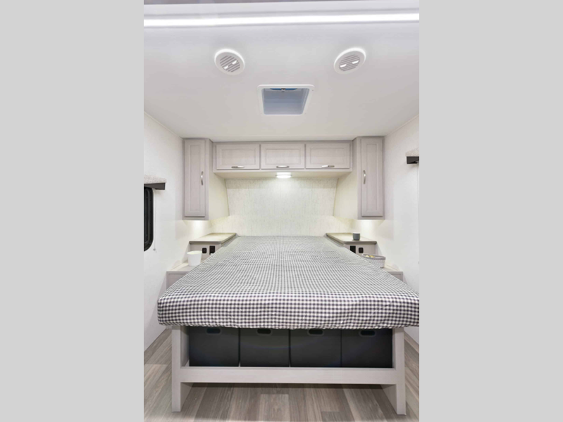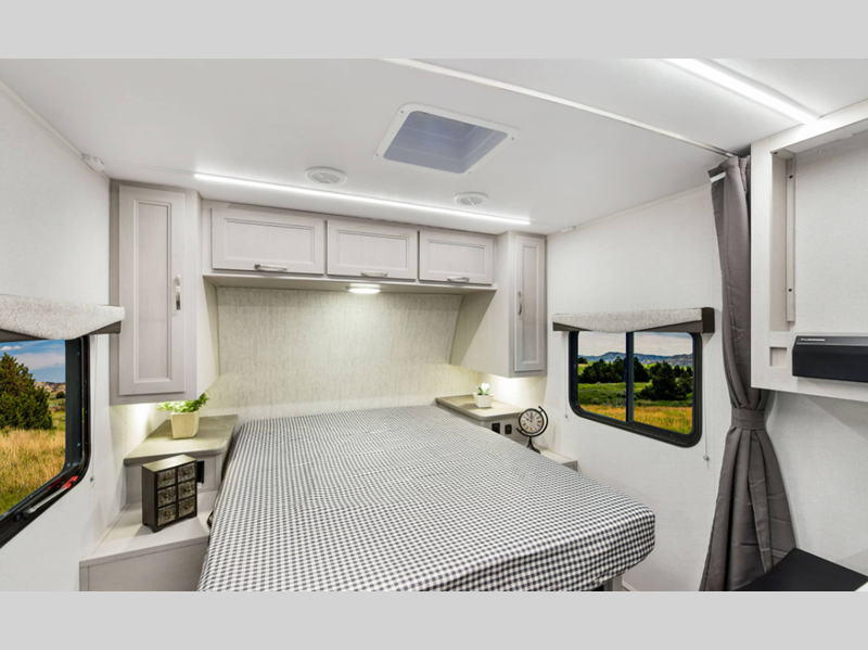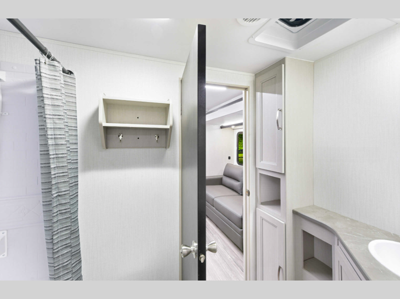 There is over 40 cu. ft. of pass-through storage so you can bring all of the outdoor essentials, and the industry first under-bed pet palace design provides a cozy place for your pet too. The strong foundation consists of a powder coated structural I-beam frame and durable Azdel composite laminated sidewalls. You'll find night shades inside, along with hidden hinges on the cabinetry, multiple 110V and USB outlets, seamless edge kitchen countertops throughout, and many more comforts.