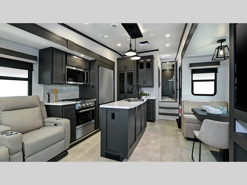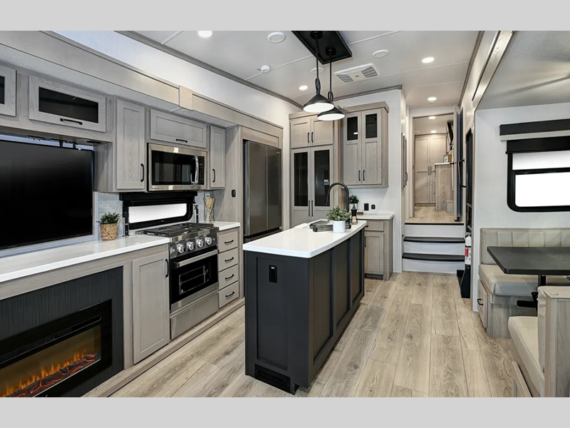 Sleeps 6 Slides 5 Tire Size 16" Furnace BTU 35000 btu Available Beds King Refrigerator Type 12V Cooktop Burners 3 Number of Awnings 1 LP Tank Capacity 30 lbs Water Heater Capacity 12 gal Water Heater Type Quick Recovery Auto Ignition Gas/Electric TV Info LR Televator Smart TV Awning Info 9' and 17' Power with Adjustable Rain Dump & LED Light Strip Axle Count 2 Washer/Dryer Available Yes Number of LP Tanks 2 Shower Type Shower w/Seat Electrical Service 50 amp Similar Floorplans