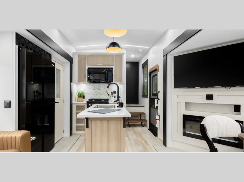 Sleeps 4 Slides 3 Length 33 ft 11 in Ext Width 8 ft Ext Height 13 ft 5 in Hitch Weight 1871 lbs Dry Weight 9380 lbs Cargo Capacity 2691 lbs Fresh Water Capacity 57 gals Grey Water Capacity 60 gals Black Water Capacity 32 gals Available Beds Custom King Refrigerator Type 12V Refrigerator Size 16 cu ft Cooktop Burners 3 Number of Awnings 1 Water Heater Type On Demand Tankless AC BTU 33000 btu TV Info LR 50" LED Smart TV Awning Info 13' with LED Lights Axle Count 2 Washer/Dryer Available Yes Shower Type Walk-In Shower Electrical Service 50 amp Similar Floorplans