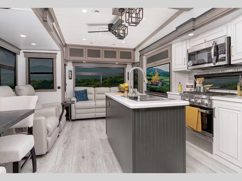 Sleeps 4 Slides 5 Length 42 ft 4 in Ext Height 13 ft 5 in Interior Color Oakmont, Woodcliff Exterior Color Volcano, Cobalt, Sterling, Glacier Full-Body Paint Choices Hitch Weight 2975 lbs Dry Weight 15063 lbs Cargo Capacity 2937 lbs Fresh Water Capacity 70 gals Grey Water Capacity 88 gals Black Water Capacity 88 gals Tire Size ST235/80R16G Furnace BTU 35000 btu Available Beds King Refrigerator Type Residential w/Ice Maker Refrigerator Size 18 cu ft Convection Cooking Yes Cooktop Burners 3 Shower Size 48" x 30" Number of Awnings 1 Axle Weight 7000 lbs LP Tank Capacity 30 lbs. Water Heater Capacity 16 gal Water Heater Type Gas/Electric Quick Recovery AC BTU 45000 btu TV Info LR 50" Smart TV, BR 32" LCD TV Awning Info 19' Electric with LED Lights Axle Count 2 Washer/Dryer Available Yes Number of LP Tanks 2 Shower Type Standard Electrical Service 50 amp Similar Floorplans