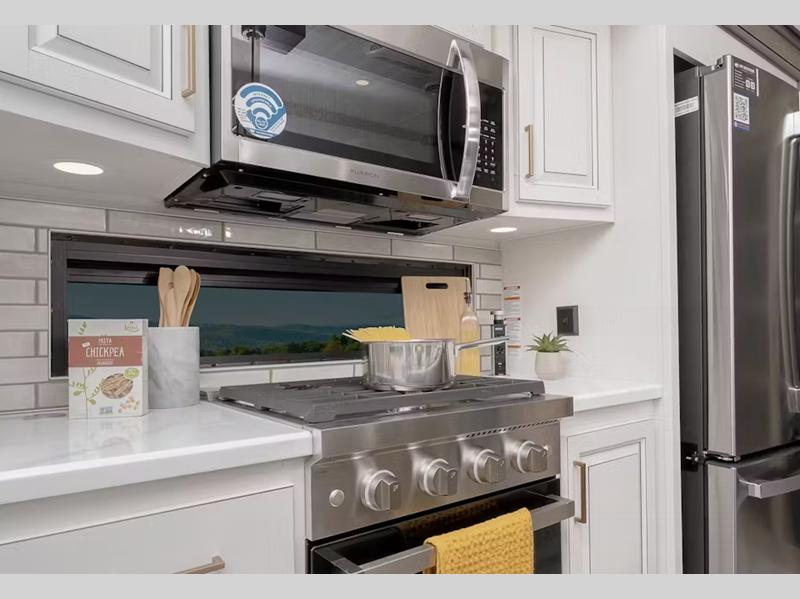 Sleeps 4 Slides 4 Length 41 ft Ext Height 13 ft 4 in Interior Color Oakmont, Woodcliff Exterior Color Volcano, Cobalt, Sterling, Glacier Full-Body Paint Choices Hitch Weight 2695 lbs Dry Weight 14290 lbs Cargo Capacity 2405 lbs Fresh Water Capacity 70 gals Grey Water Capacity 88 gals Black Water Capacity 49 gals Tire Size 215/75R17.5"H Furnace BTU 35000 btu Available Beds King Refrigerator Type Residential w/ Ice maker Refrigerator Size 18 cu ft Convection Cooking Yes Cooktop Burners 3 Shower Size 48" x 30" Number of Awnings 2 Axle Weight 7000 lbs LP Tank Capacity 30 Water Heater Capacity 16 gal Water Heater Type Gas/Electric Quick Recovery AC BTU 45000 btu TV Info LR 50" Smart TV, BR 32" LCD TV Awning Info 11' & 13' Electric with LED Lights Axle Count 2 Washer/Dryer Available Yes Number of LP Tanks 2 Shower Type Shower w/Seat Electrical Service 50 amp Similar Floorplans