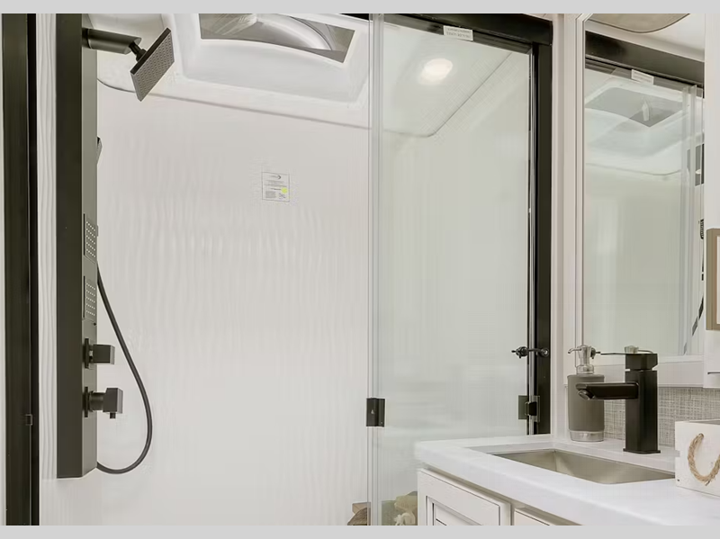 - Residential 30" X 48" fiberglass shower w/ decorative glass enclosure, skylight, & molded accessory/foot shelf