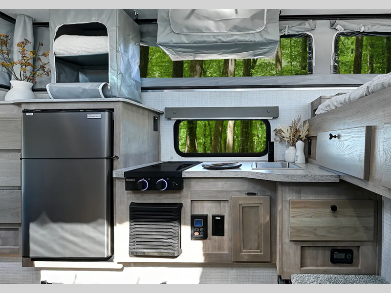 Sleeps 3 Length 14 ft 10 in Ext Width 7 ft 2 in Ext Height 6 ft Exterior Color White, Grey Dry Weight 1826 lbs Fresh Water Capacity 15 gals Black Water Capacity 7 gals Furnace BTU 20000 btu Available Beds Queen Refrigerator Type 12V Refrigerator Size 3.3 cu ft Cooktop Burners 2 Floor Length 8 ft 6 in LP Tank Capacity 20 lbs Truck Bed Size Long Number of LP Tanks 1 Body Style Pop-Up -